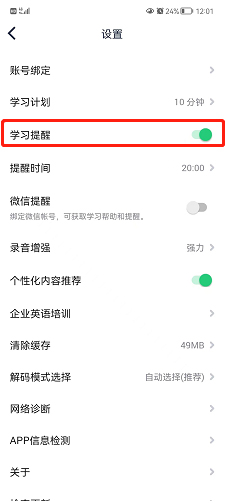 将【学习提醒】打开即可完成