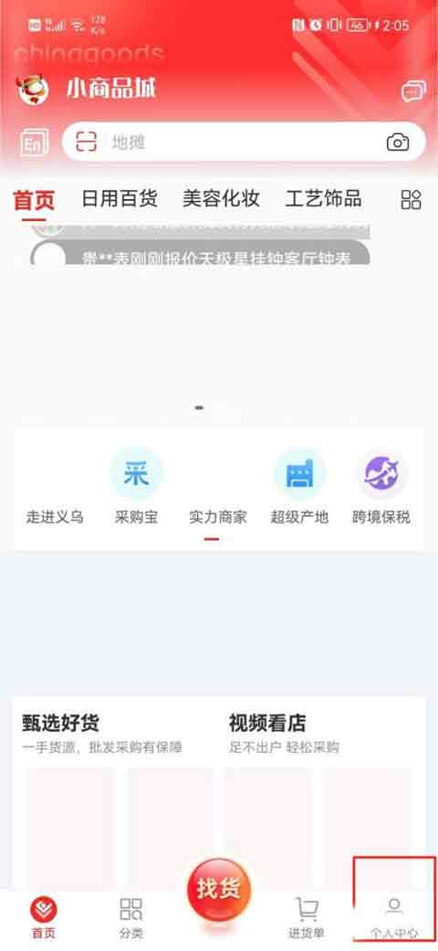 第一步:进入【小商品城】APP首页,点击右下角【个人中心】,详见下图所示;