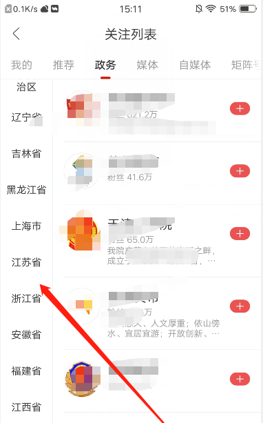 3、点击政务选项即可按省份查找本地的媒体号进行关注了,如图:
