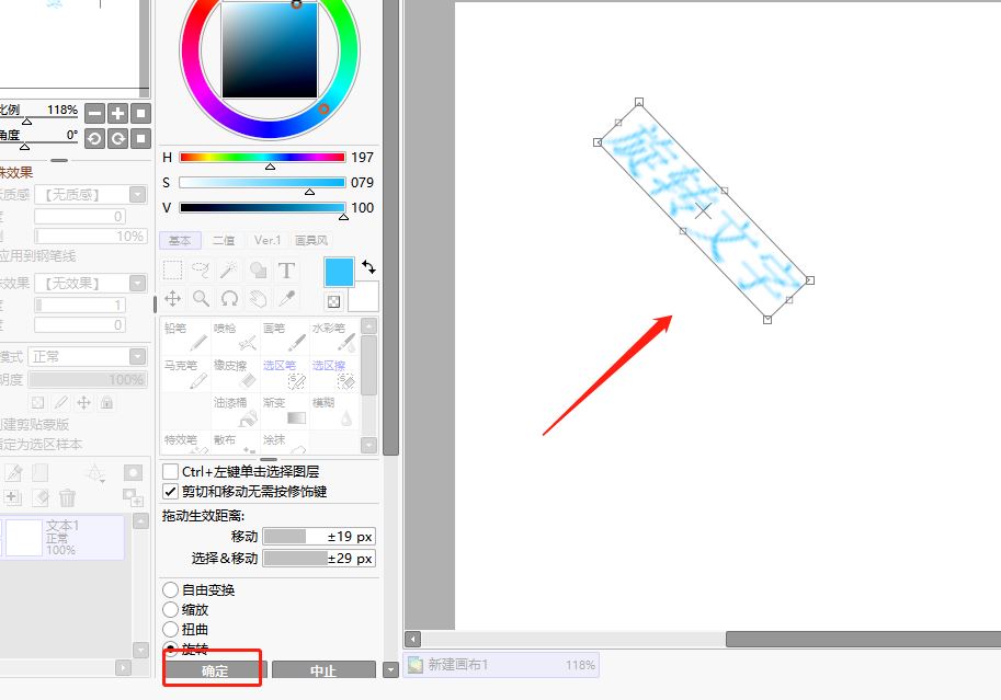 6.当画布中的鼠标光标变为弯曲的双箭头图标时,根据自己的需求来旋转文字即可,最后按下确定按钮就可以了