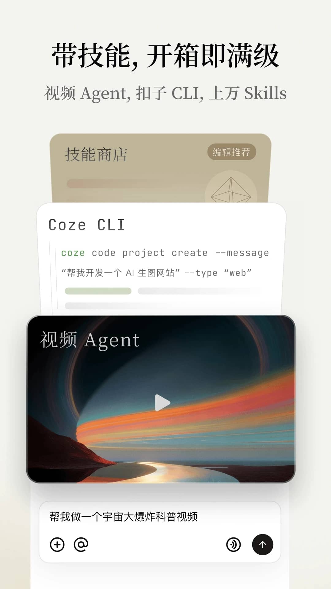 现在,让这一切成为过去。扣子空间专为追求高效与卓越的知识型工作者和学生群体量身定制。我们整合了前沿的AI大模型能力,将复杂的任务流程封装成一个个强大而易用的智能体。你无需成为技术专家,只需用最自然的方式下达指令,剩下的交给我们。