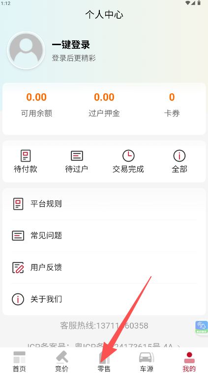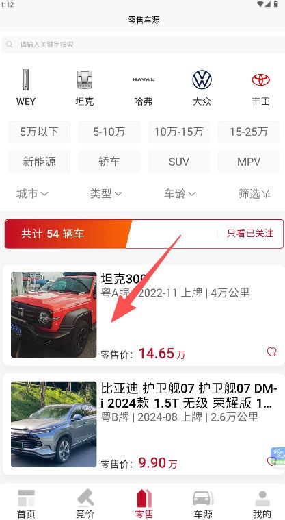 1、在应用底部导航栏点击“零售”按钮,进入零售查看在售车辆列表。