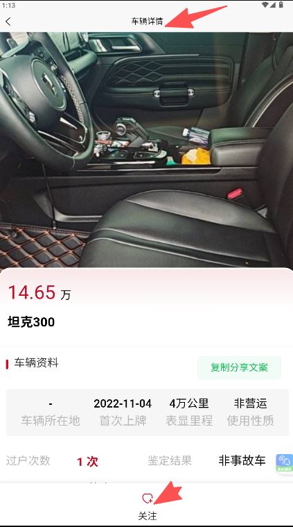 3、在车辆详情页查看具体信息,点击底部“关注”即可收藏该车后续查看。