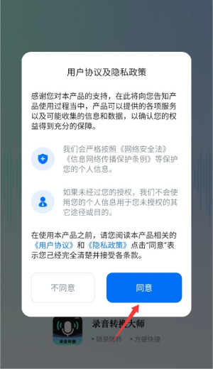 1、首次启动应用时,系统会显示用户协议和隐私政策,阅读后点击同意按钮进入主界面。
