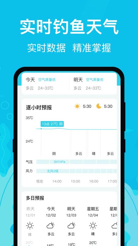 软件支持天气预报查询,用户可随时查看各样钓鱼点的天气预报信息。