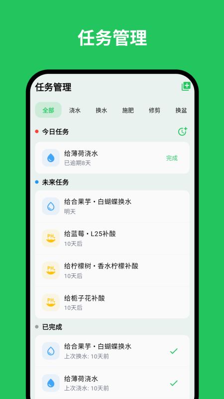 可以将所有的植物养护任务有序记录保存,根据分类找到任务信息进行养护;