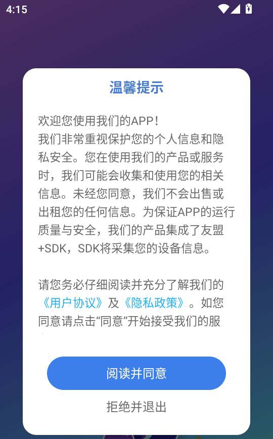 1.首先打开软件浏览“温馨提示”后,点击“阅读并同意”按钮进入APP