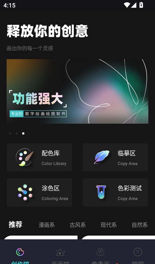 1、通过本站下载软件并安装打开,进入软件后就是【创作馆】页面,我们可以选择配色库、临摹区、涂色区、色彩测试进入;