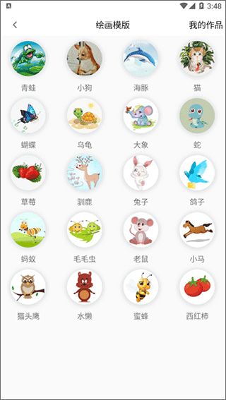 简笔画素材功能,提供各种动物、植物等简单形象供儿童参考绘画,学习更加容易。