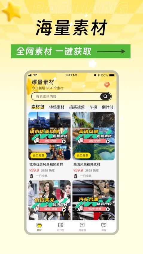 爆量素材app中有海量视频、文案、图片素材,各种绿幕素材,4K素材、转场特效素材、倒计时素材、片头片尾素材等大量高清无水印视频素材,一键就能下载,轻松上手。还有视频拍摄剪辑教学,账号涨粉变现等实用课程,一站式服务短视频创作者。