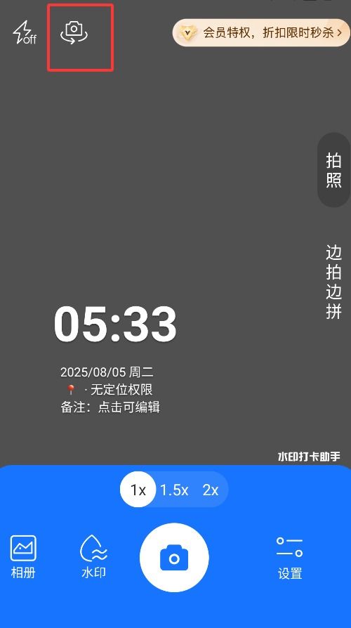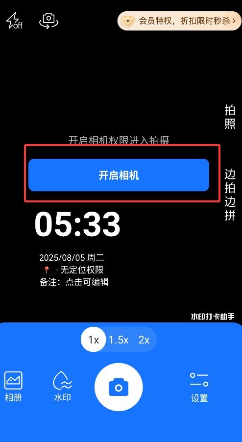 3、开启相机即自动加载水印模板,拍照时实时显示水印效果,简化操作流程。