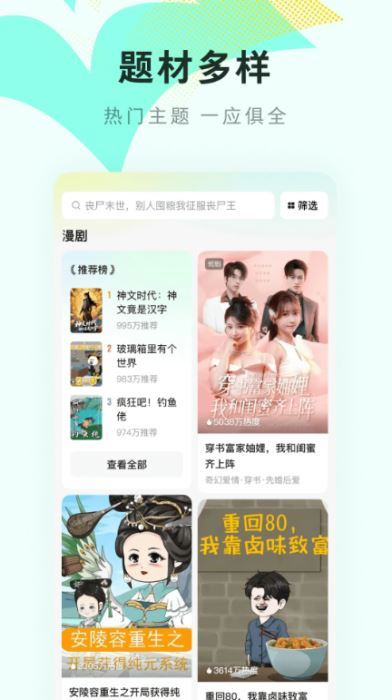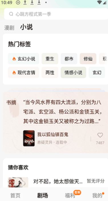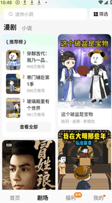 2、剧场界面中会有漫剧和小说两个入口,其中漫剧中有海量好看搞笑的沙雕漫画短剧