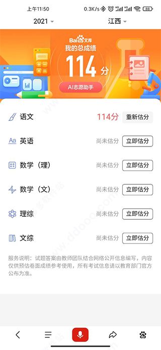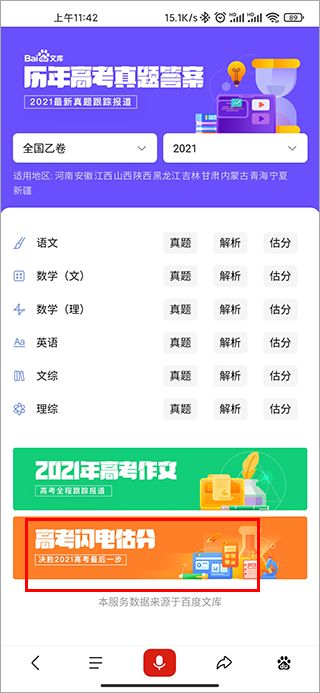 闪电估分2025app是一个高考估分系统,在该系统中主要就是为大家提供了全国各地的高考估分功能,并且无论是语文、理科数学、文科数学、英语,还是文综,理综还这里全部都有提供估分功能,这个估分功能不是直接输入分数就是,而是为大家提供了试卷的每道题供大家再次回顾答题下,当然依然提供了相对应的正确答案和分值以供参考,从而即可准确的进行估分啦。不过,虽然说闪电估分app看着名字也就是一个估分功能,但由于是基于百度提供的,那么估分后你还可以试用下里面的ai志愿助手来帮大家参考下高考后续的志愿填报,欢迎有需求的用户们自行下载体验哦。
