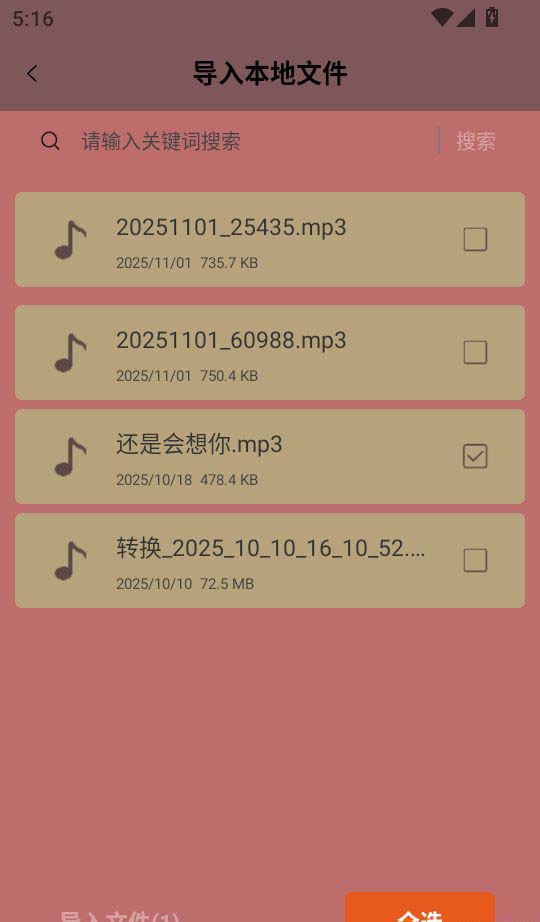 4.最后进入“导入本地文件”界面,勾选音乐文件后点击左下角“导入文件”按钮就完成了