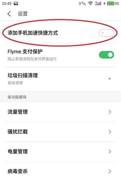 2、在设置页面中找到“添加手机加速快捷方式”,将右边的开关勾选上。