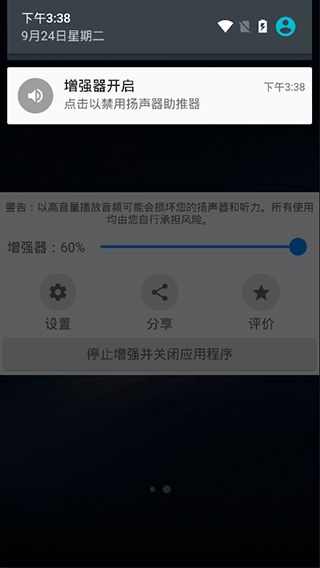 3、当您将增强器设置为0时,扬声器助推器将关闭。通知图标只是为了便于启动。如果您不想在扬声器助推器关闭时看到通知图标,请打开扬声器助推器并关闭此应用程序。