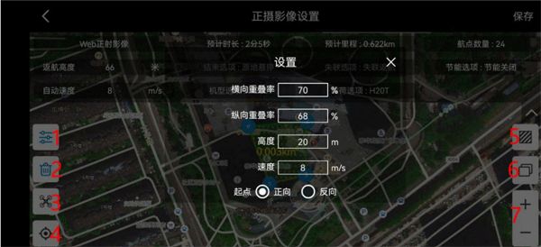 邻两张照片的重叠度;高度:航线飞行高度;速度:航线飞行速度;起点:可根据飞机位置