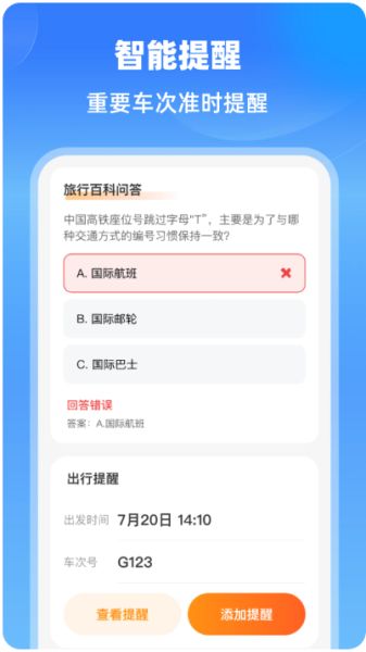 4、通过常识挑战问答形式,帮助用户了解铁路出行相关知识,如高铁座位号编号习惯等。