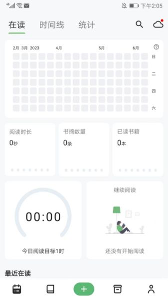 1、打开纸间书摘官方版,在日历界面,可以看到当前的阅读时长、书摘数量和已读书籍、以及进行阅读目标的设定等,
