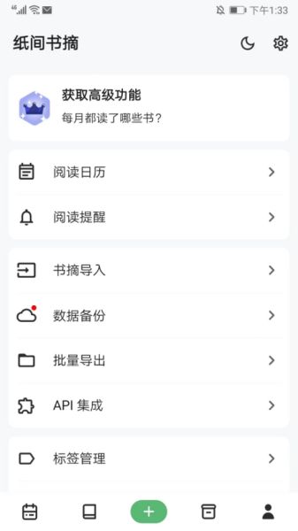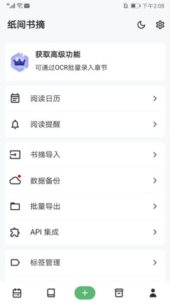 5、在用户中心界面,可进行阅读日历、阅读提醒、书摘导入、数据备份和批量导出等一些设置和功能的使用,以上就是纸间书摘官方版的用法了。