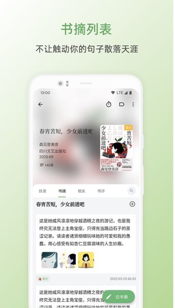 除了以上功能外,纸间书摘还提供了一些非常实用的特性和功能,例如,用户可以创建自己的笔记本和标签,方便地组织和管理不同类型的笔记;还可以与好友分享自己的读书笔记和心得体会,增进交流和互动等等,如果你也喜欢阅读喜欢思考的话,不妨下载试试吧。