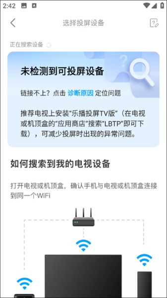 3、点击投屏按钮后,系统会自动搜索同一网络下可用的投屏设备,并将它们显示在屏幕上。这里小编没有开启投屏设备所有未找到。