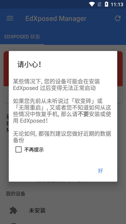接下来重启手机安装Edxposed管理器,不安装将提示你下载最新版本