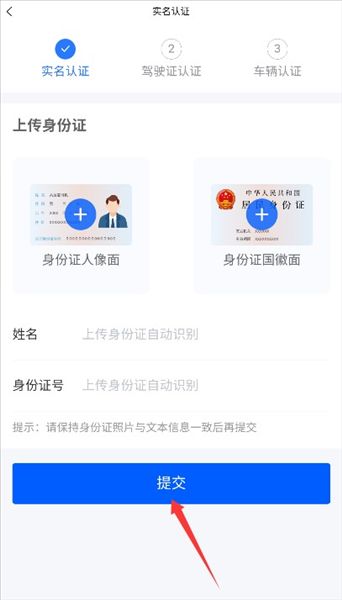 3、按要求上传身份证正反面照片,填写真实姓名与证件号码,提交后等待实名认证审核。
