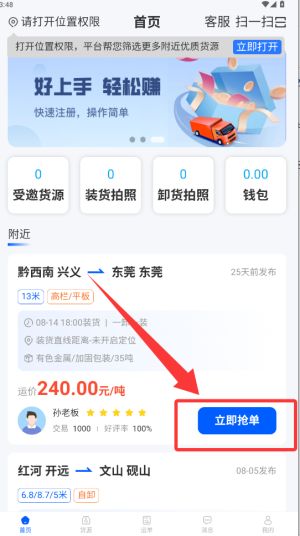 2、看到合适订单直接点击一键抢单,成功接单后及时联系货主确认细节,并开启导航前往装货地点。