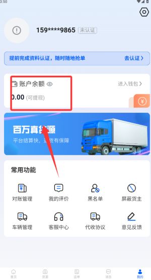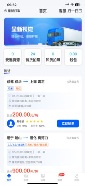 全方位数据展现:首页清晰展示运输统计和钱包余额,实时推送周边货源,助您抓住每个商机。