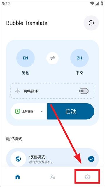 1、下载安装并打开泡泡屏幕翻译App,选择右下角设置进入后选择语言