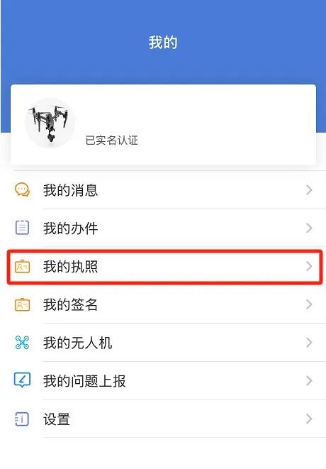 6、在个人中心页面中,点击“我的执照”选项,便可以查看您的无人机执照相关信息,执照显示内容与网页端一致,并且同时支持“查看详情”获取更详细的执照信息。