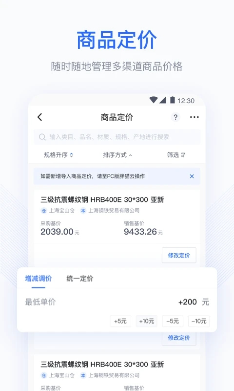 胖猫云ERP主要是做钢贸生意的管理软件,全场景全链路的SaaS产品,助力企业数字化经营,深入细分场景 提供准确的行业解决方案,钢铁全链路运营,胖猫云都有完整解决方案!云目前提供微商城、进销存管理、微信小程序、全业务流程数据化等服务,全面帮助企业客户布局移动社交电商和全渠道新零售赛道。同时帮助客户实现网上开店、线上营销、拓展销售全渠道和获取订单全流程,实现业务数字化、管理科学化、经营可视化的全新业务形态。需要的朋友快来下载吧!