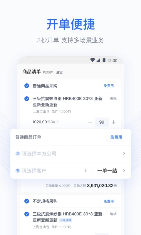 依据钢铁不同业务场景,支持一单一结、网价结算、后定价等模式。