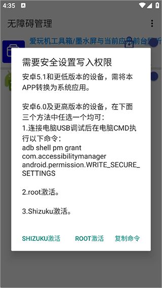 2、Shizuku的激活方式可以在本站或其官网上查看教程,无障碍管理器通过Shizuku授权后就会提示用户激活成功