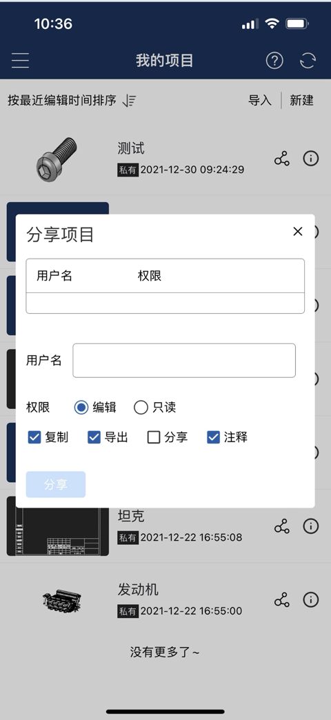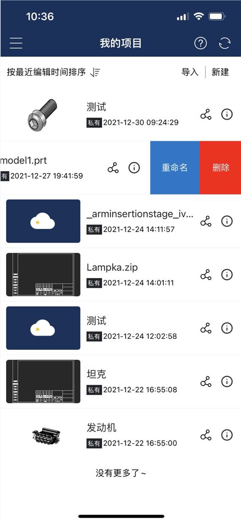 2、导入: 点击“导入”,显示当日可用的导入次数,在手机文件中选择支持的模型格式,选择后开始进行导入。支持的模型格式为:IGES、STEP、PTC、NX、CATIA、SolidWorks、ParaSolid、OBJ、STL、IFC、3DM、Revit、PDF、DWG。 (说明:在项目管理界面导入的文档自动创建一个项目,项目中显示导入的文档。)