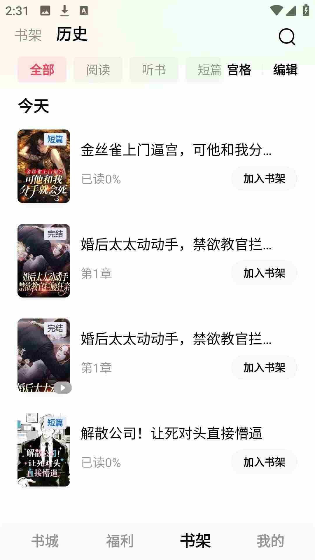 7、观看的小说加入书架或者在历史中查看,方便下次观看。