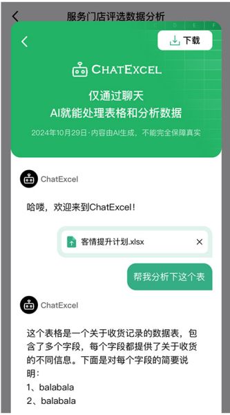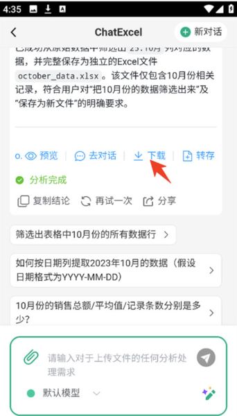4、接着它就会帮你处理表格并生成处理后的新表格进行下载,你也可以继续以聊天的方式让它对表格进行再次处理