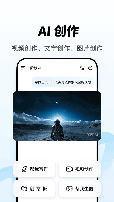 跃问app,现更名为:阶跃AI,其一款集多功能于一体的AI智能助手,现已强势接入Deepseek-R1满血版,以更强大的深度思考能力,全面支持文档、图片、表格数据等多种形式的处理,让AI更懂你,服务更贴心。同时跃问app不仅是你的问答助手,更是你工作学习中的得力伙伴与生活中的倾诉对象。它集搜索、图片理解、文档总结、拍照提问等功能于一身,无论你是遇到难题需要解答,还是想要快速获取信息,跃问都能轻松应对。另外app还具备AI写作、智能生图、生成视频、AI代码等创作能力,一键操作,让灵感自由绽放,助你轻松完成各类创作任务,有需要的用户可以在本站免费下载使用。