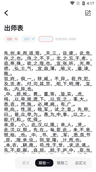 1、把要背诵的内容隔字抠掉,用x代替。扣字后得到两个扣掉后的文本,两个文本合起来就是原来要背诵的内容啦。