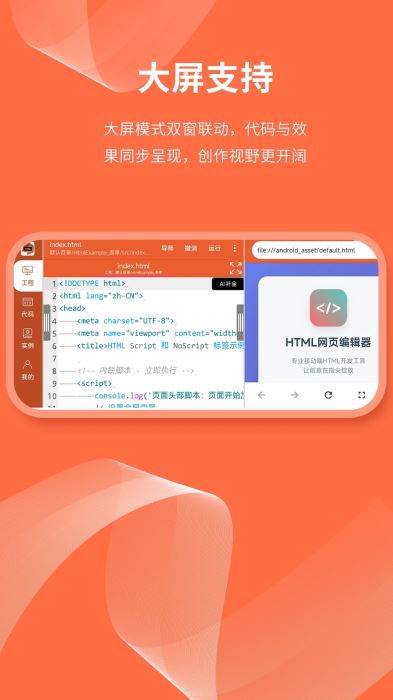 html网页编辑器手机端使用的网页编辑学习软件,这款软件提供HTML、CSS、JavaScript 全知识点,从入门到精通,大屏模式实现双窗联动,代码与效果同步呈现等功能,欢迎下载使用。