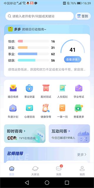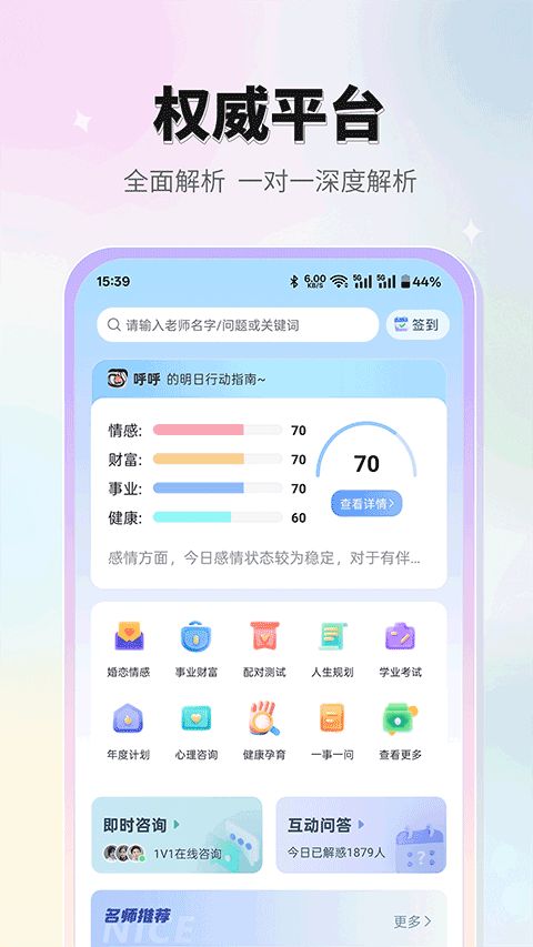 高人汇app现已更名为:高人汇咨询app,这是一款集传统周易文化与现代互联网技术于一体的综合性服务平台,专注于为用户提供真人在线命理咨询服务。平台汇聚数百位资深易学大师,涵盖八字算命、风水调理、起名择日、塔罗占星等多元服务,支持婚恋情感、事业财运、健康孕育等全场景测算。用户可通过高人汇app中的1对1真人咨询、直播互动、即时问答等形式,获得个性化运势解析与开运指导。同时app严格保障用户隐私,并推出“不满意可退款”“免费提问互动吧”等保障机制。此外,高人汇app还提供开运饰品电商、易学课程培训等增值服务,构建起从测算到改善的闭环生态,有需要的用户可以在本站免费下载使用。