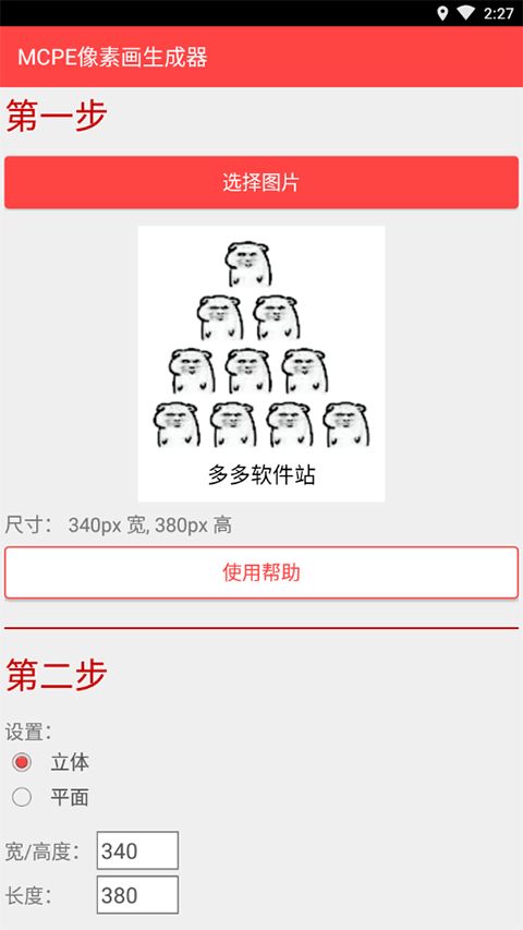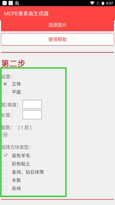 2、其次选择要立体还是平面,然后在输入宽/高度和长度,目前最大尺寸为512,请记住,一个minecraft PE的世界高度是为128块方块所以在选择立体生成的时候宽/高度不能够超过128,然后在设置好像素画的层数目前最大层数为16层。建议尺寸最大不要超过300,层数最多选择6层,因为尺寸和层数越大生成的时间就越久。