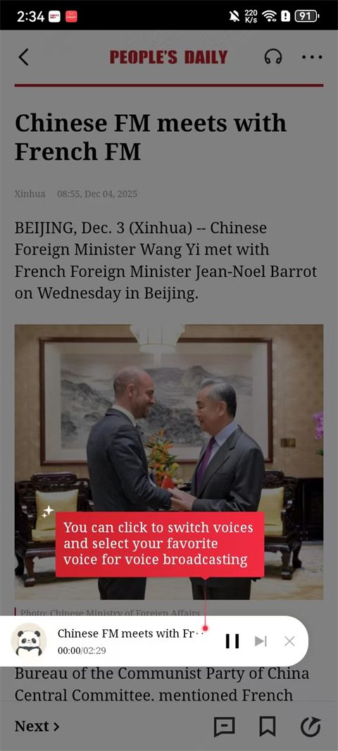人民日报英文客户端是由人民日报社推出的一款优质的线上咨询阅读软件,也被称作peoples daily或者是People。该版本是人民日报专门为海外华人外侨以及国际友人准备的,当然,如果你是想锻炼提高自己的英语能力也可以在日常生活中使用这款软件。人民日报英文版app最新版目前包含的频道有Top news(要闻), China(国内新闻), World(国际新闻), Opinions(观点), Photos(图集), Business(经贸), Travel(旅游), Services(服务), Culture(文化)和Lifestyle(生活)。它涵盖的版块是非常丰富的,用户可以根据自己想要了解的方向来在这里进行精准选择。如果你是一个英文爱好者,人民日报英文版app最新版的一个功能绝对会深受你的喜爱,那就是可以随时查阅陌生的单词,在文章资讯中遇到自己不认识的单词随时可以进行翻译,长按单词会跳出功能菜单,选择其中的翻译,点击后就能够看到该单词的详细介绍和释义。除此之外,还有一个功能是大家使用频率最高的。那就是语音助手,用户可以直接与语音助手进行在线对话,在休息闲暇时间可以与语音助手放松心情。欢迎有需要的朋友在本站点击下载使用。