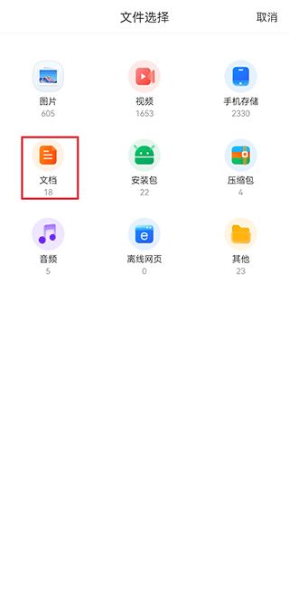 3、然后在文件选择中点击文档,在文档界面中点击要上传的简历