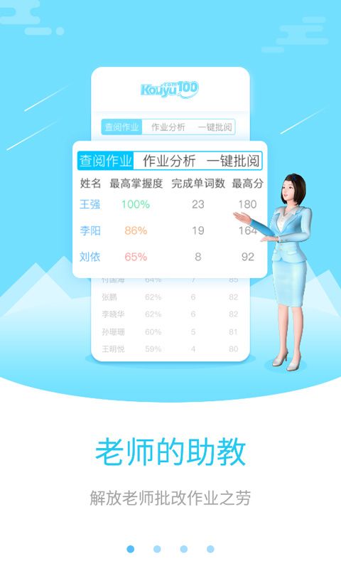 口语100教师版app是专为老师而研发的一款教学软件,为学校教师提供了移动端线上阅卷功能,老师可以通过在它,在线布置和查阅学生听说作业。而且,该软件拥有自动批改在线作业功能,可以让教师从繁重的线下阅卷工作中解脱出来,真正减轻教师工作量。同时,口语100还会实时的记录了每位学生的成长数据,以便老师能更加了解学生的知识缺陷,从而进行针对性教学,大大提升教学质量。
