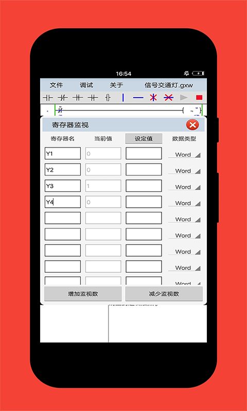 2、无需连接设备,支持本地仿真,查看各个寄存器的值。梯形图运行时,提供修改和查看各个寄存器的值。
