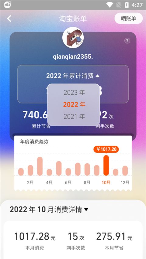 4、如果想要知道自己每年的消费额度的话,可以点击查看账单,选择你想要查询的年份,它就会为你提供相关的数据;