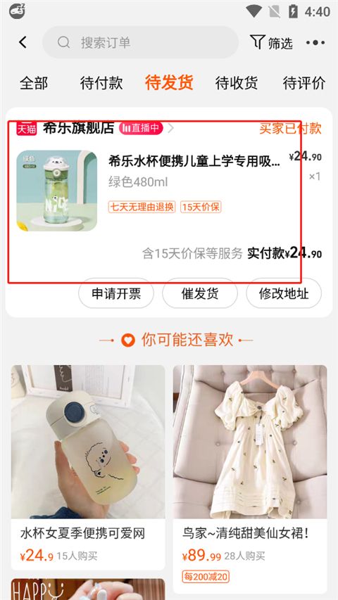 1、进入我的界面,选择订单,点击代发货的订单,然后点击进入;