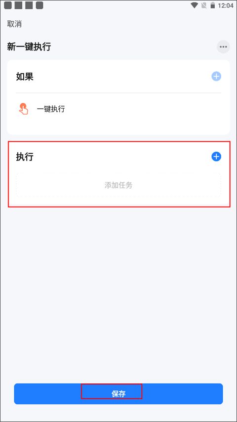 3、进入到执行操作编辑界面,在执行右边的“+”中添加任务和设备,最后点击保存即可执行相关的操作。